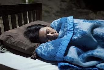 Une femme essaie de dormir sous une couverture bleue. c’est peut-être son rêve que l’on voit, toile déroulée devant notre regard représentant un paysage, puis, déroulée à nouveau, un autre paysage. Elle ouvre les yeux, croise ses mains, ferme les yeux. Le paysage, l’autre paysage. S’éveille-t-elle ? Une petite flamme jaillit. Des bruits, chants d’oiseaux, feuillages agités, se font entendre et le bois qui brûle et craque. Le feu grandit, s’installe dans le paysage. Est-ce chaleur du sommeil ? Est-ce mort saisie ? Est-ce toujours ? Est-ce jamais ?