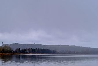 La cathédrale, le CEGEP et le Château Baie-Comeau dans la brume et au soleil à marée basse…