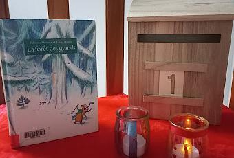 Chaque jour, aux côtés de notre boîte aux lettres de l'Avent, les garçons trouveront une lecture de Noël. L'idée n'est pas de mettre 24 livres neufs, ça pourra être un album qu'ils connaissent déjà mais que nous n'avons pas lu depuis longtemps, ou encore un livre emprunté à la bibliothèque. C'est d'ailleurs le cas de celui qui a ouvert le bal aujourd'hui. Un livre qui nous a bien plu et dont j'ai eu envie de vous parler. Voici La forêt des grands de Fabienne Mounier et Daniel Hénon.
