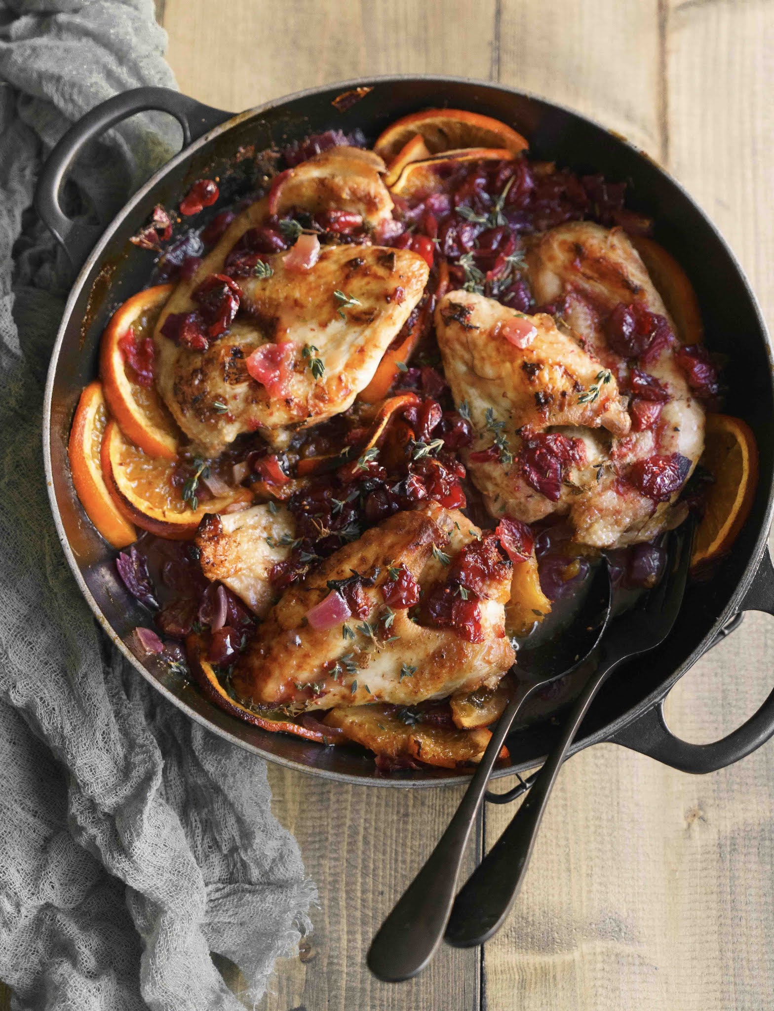 Préchauffez le four à 180°CEpluchez l'oignon coupez-le en morceaux, coupez des tranches d'orange de taille moyenne, puis coupez-les en 2. Dans une poêle sans matières grasses, faites dorer les morceaux de poulet sur les 2 faces . Déposez les dans un grand plat de four, ajoutez les morceaux d'oignon, les tranches d'orange, le thym ( 3 branches) , sel , poivre.Répartissez sur le dessus la sauce aux cranberries et le vinaigre balsamique et 1 cuil à soupe d'huile d'olive. Faites cuire 30 minutes.