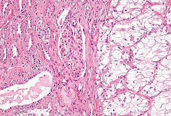 Micrographie d'un carcinome rénal, à droite de l'image; le rein non tumoral est à gauche de l'image.