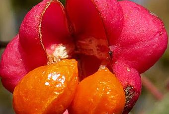 Euonymus europaeus (Fusain d'Europe) : arbuste à tige ornée de 4 bandes lignifiées brunes (d'où son nom de Bois carré) et à feuilles opposées ; limbe foliaire ovale à elliptique vert foncé devenant rouge à l'automne ; petites fleurs vert-jaunâtre en cyme pédonculée ; la capsule tétragonale à 4 valves, verte puis rouge (de là son autre nom de Bonnet d'évêque), s'ouvre en découvrant les graines à arille charnu orangé.