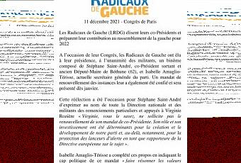 A l'occasion de leur Congrès, les Radicaux de Gauche ont élu à leur présidence, à l'unanimité des militants, un binôme composé de Stéphane Saint-André, co-Président sortant et ancien Député-Maire de Béthune (62), et Isabelle Amaglio-Térisse, actuelle secrétaire générale du parti. Un mandat de renouvellement des instances leur a également été confié et sera présenté dès janvier.