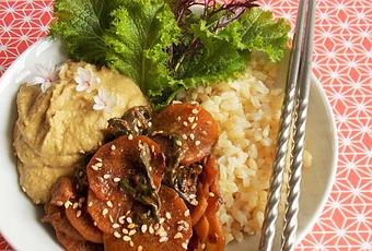 J'ai fait un Buddha bowl, un plat complet, composé de la tartinade, de riz complet, de salade et de radis d'hiver et de tétragone (une petite plante qui ressemble à de l'épinard) à l'asiatique avec une sauce à tendance japonaise. J'ai terminé par des fleurs d'ail de l'Himalaya et de graines de sésame.