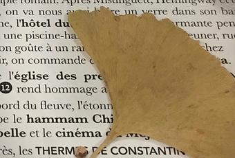 Une feuille de ginkgo biloba est tombée sur le document que j’ai photographié dans l’exposition en cours à la Médiathèque d’Alfortville (94), cachant une partie du texte. Je vous invite à le reconstituer, ou plutôt à en compléter les parties cachées en vous efforçant de ne pas trop vous éloigner de la dimension originale.