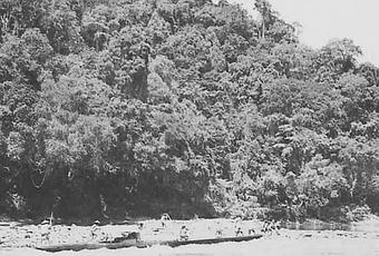 Au loin, on voyait poindre une chaîne de montagnes ; la rivière, encore assez large, avait un débit relativement important et circulait au milieu de forêts qui lui semblaient impénétrables. Deux jours passèrent avant d’apercevoir de petites clairières, certaines étaient plantées de riz. Lorsque Luca eut croisé quelques praos, il devina qu’un gros village devait se situer dans les alentours. Ce fut le cas et, bientôt quelques maisons éparses firent irruption sur les berges ; il décida de demander l’hospitalité. Il aurait été trop périlleux de s’aventurer plus avant et il devenait raisonnable de mettre rapidement un terme à l’expédition. Malgré une volonté farouche d’aller toujours plus loin, la raison avait encore quelque emprise sur mon compagnon à cette époque. Ce fut une sage décision, car le village et ses habitants allèrent se révéler particulièrement intéressants.