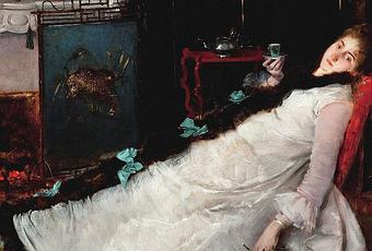 Cet autre tableau de Gervex, intitulé La visite du médecin nous montre ce dernier comme une silhouette noire, raide, de dos, en train de fixer une femme très pâle, étendue dans un lit où le drap ne couvre plus sa poitrine, à peine voilée par un sous-vêtement. Là encore le contraste est saisissant entre le noir de l’homme et la blancheur éclatante de la femme et du lit où elle est allongée. Le noir c’est la matière, le sérieux, l’autorité. Le blanc tout ce qui évanescent, vulnérable, rêveur, hors-sol, pâleur maladive, sainteté. Une nouvelle fois, la femme inconsciente, allongée, est dominée par l’homme debout, qui l’analyse, la fixant avec insistance.