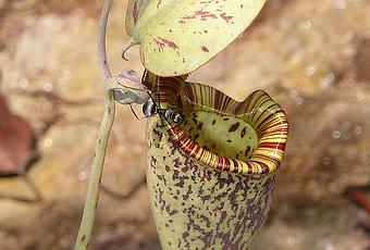 Le népenthès est une plante carnivore assez célèbre, presque aussi célèbre que la dionée. Ses feuilles en forme d’urne recueillent et stockent l’eau. La plante attire ses proies en utilisant des couleurs vives, une fragrance spécifique et un nectar unique. Sans méfiance, les insectes rampent tout au bord de l’urne, glissent inévitablement et tombent dans le puits empli d’eau. S’ils parviennent à nager et essayent de grimper, les parois de l’urne, glissantes ou couvertes de poils pointant vers le bas, les empêchent de s’échapper. Les insectes se noient et finissent par se dissoudre avec les enzymes digestives sécrétées par les cellules végétales.
