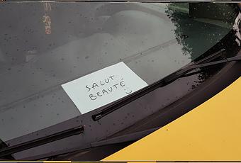 J'avais aimé cette déclaration affichée derrière la pare-brise de la voiture jaune en face de l'hôtel, au point de quitter mon poste pour immortaliser l'instant. On ne saura pas à qui était adressé le message. Peut-être à la pervenche tentée de verbaliser le stationnement illicite. Mais... j'suis nouille, ladite fonctionnaire de police a été remplacée par les scan-cars qui sillonnent la ville.
