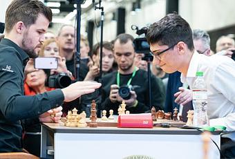 Le champion du monde d'échecs Magnus Carlsen face à Alireza Firouzja, récemment naturalisé Français, lors du championnat du Monde de blitz 2019 - Photo © FIDE