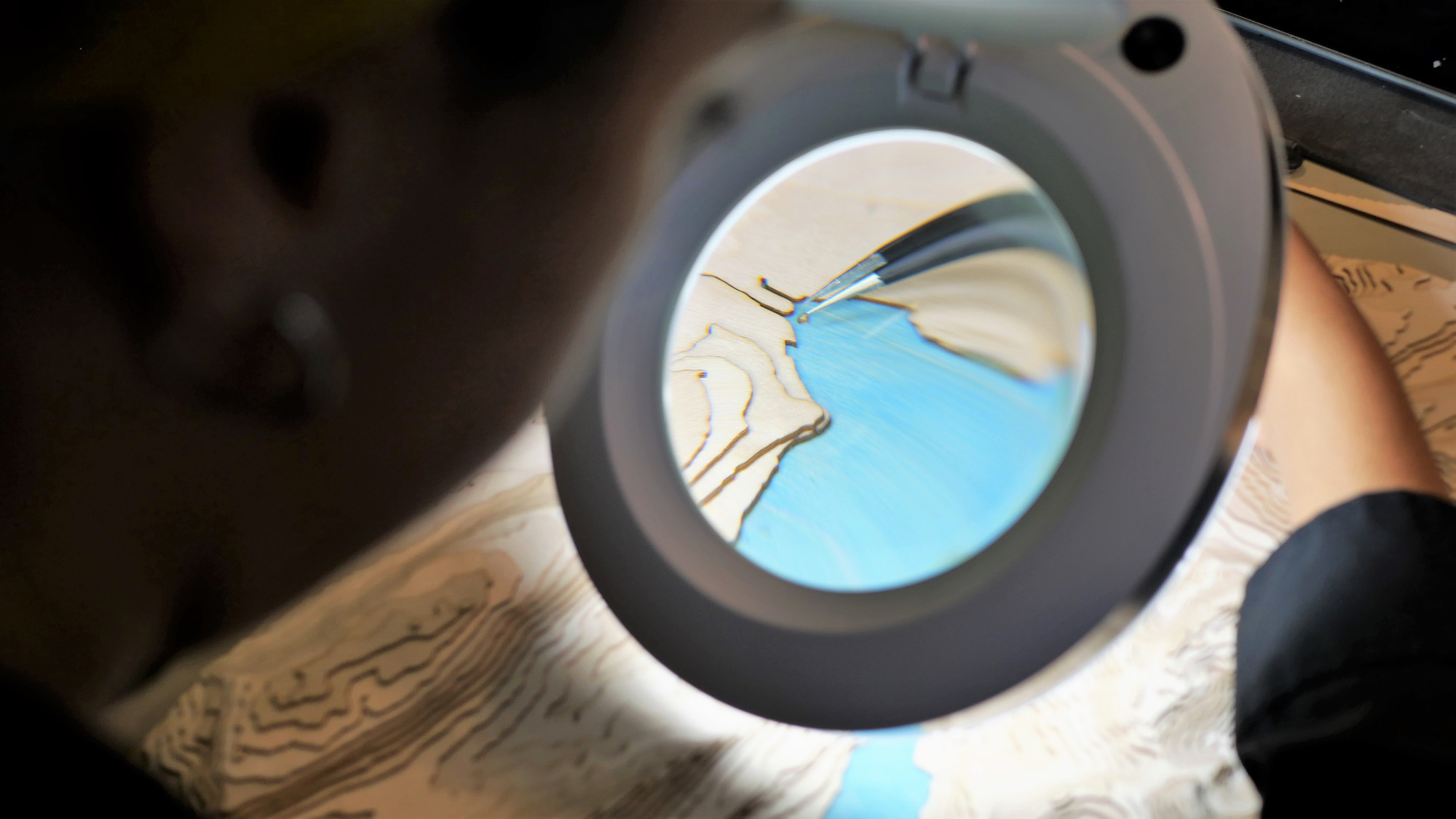 Ils conçoivent à la demande (ou si vous trouvez le bonheur dans leur catalogue) des tableaux intégrant des cartes topographiques (mettant en valeur les reliefs) en retirant les détails cartographiques (routes, nom, etc) le tout à partir de très fines feuilles de bois, soigneusement découpées, empilées et teintées. Un travail minutieux d’assemblage offrant une fenêtre sur une ville, une côte, un lac où vous avez passé de bon moment.