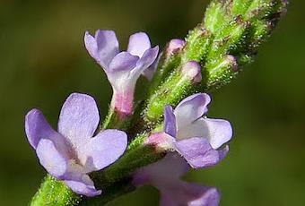 Verbena officinalis (Verveine officinale) : herbacée à tige dressée rameuse ; feuilles opposées pennatifides ; inflorescence en épi lâche terminal, corolle tubulaire asymétrique à 5 lobes rose pâle à lilas.