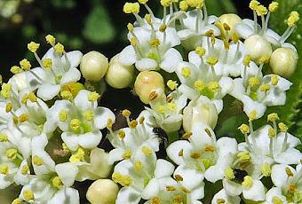 Viburnum lantana (Viorne lantane) : arbuste à rameaux et feuilles velus ; fleurs en cymes corymbiformes terminales, toutes semblables ; bouquet de drupes ovoïdes charnues, à un noyau, rouges puis noires et aplaties.