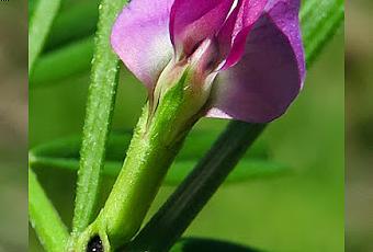 Vicia sativa (Vesce cultivée) : feuilles à 3-7 paires de folioles obovales, foliole terminale remplacée par une vrille ramifiée ; fleurs papilionacées, solitaires ou par paire, roses à bleu violacé, stipules tachées de noir.