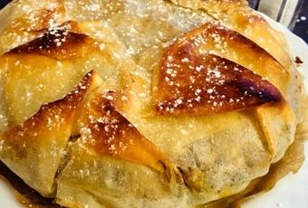 Pastilla au confit et foie gras, pistaches, raisins secs et pignons.