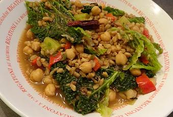 Faire revenir les feuilles de chou dans un peu d'huile d'olive et un peu de sel pendant 3 à 4 minutes, tout en les laissant croquants. Ajouter la moitié à la minestra et éteindre le feu après 5 minutes