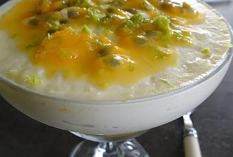 Garnir les verres au dernier moment avant de les servir du reste du mélange de kiwi et fruit de la passion et saupoudrez du zeste de citron vert.