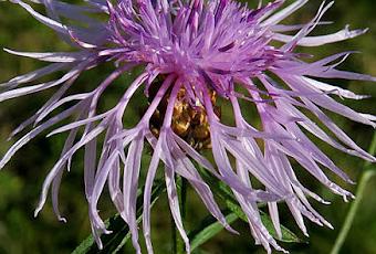 Centaurea jacea (Centaurée jacée) : feuilles ovales à elliptiques, entières ou très faiblement lobées ; bractées du capitule plus ou moins frangées. Prairies, bords de chemin, friches...