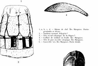 Photo 1 : Planche d'artefacts polynésien in "Collections polynésiennes du Musée d'Histoire naturelle de Cherbourg" par Anne Lavondès in Journal des Océanistes 51-52, 1976.