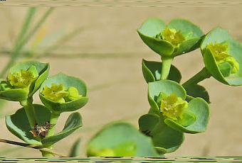 Euphorbia paralias (Euphorbe des dunes) : plante vivace glabre ; tiges dressées, souvent ligneuses à la base ; feuilles imbriquées, entières, oblongues lancéolées ; ombelle à 3-6 rayons, bractées suborbiculaires en rein ; glandes en croissant à cornes courtes, capsules trigones granuleuses, à sillons profonds.
