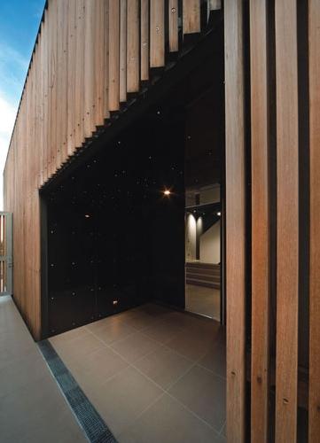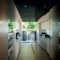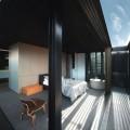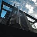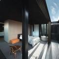 Un système de persiennes verticales métalliques et de coursives internes permet d’isoler les pièces d’un couloir qui devient terrasse au gré des mouvements des persiennes qui occultent la lumière, la laissent passer ou s’escamotent intégralement pour profiter du paysage.