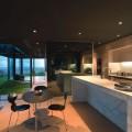 Les pièces sont dotées de baies vitrées escamotables également. On est donc en plein air intégral au coeur même de la maison si on le souhaite et ce, pas forcément dans un mode exhibitionniste puisque l’on peut masquer la vue. Les couloirs, eux, restent découverts. Un excellent compromis.