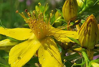 Hypericum perforatum (Millepertuis perforé) : herbacée vivace à tige dressée marquée de 2 côtes longitudinales saillantes ; feuilles opposées sessiles, ovales-elliptiques, pourvues de nombreuses glandes translucides (aspect perforé par transparence), bordées de points noirs ; corymbe de fleurs jaunes à 5 pétales asymétriques avec un bord presque droit et l'autre légèrement arrondi ; sépales aigus, nombreuses étamines groupées en faisceaux