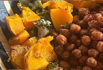 5. Verser la sauce tahiné sur le chou kale et mélanger. Placer les pois chiches au centre du saladier et garnir le pourtour de morceaux de potimarron