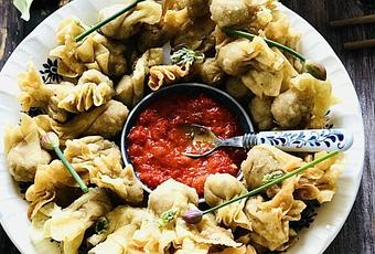 6 – Bien fariner chaque feuille afin qu’elles ne se collent pas encore elles. Il est recommandé de déjà façonner chaque wantan, on peut soit les cuire dans la foulée en friture ou en bouillon ou encore les congeler. On peut également les frire et les congeler après pour enfin les avoir sous la main lorsque l’on reçoit des invités en les passant au four pendant 10 à 15 minutes à 200 °C.