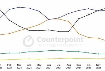 Selon le cabinet spécialisé Counterpoint, qui se charge de dresser tout un tas de statistiques, la part de l'iPhone en pourcentage de parts de marché a d'abord chuté lourdement en début d'année 2021... avant de rebondir très, très fortement jusqu'à la fin de l'année. C'est tout le contraire de Xiaomi. Quant à Oppo et Realme, c'est le calme plat, se plaçant entre 2 et 8% sur l'ensemble de l'année.