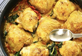 Faites dorer, sans matières grasses, les hauts de cuisses côté peau. Retirez le gras de cuisson et retournez les morceaux de poulet, ajoutez du sel et saupoudrez de paprika fumé, faites-les cuire 15 minutes. Retirez les morceaux de la poêle et enlevez l'excédent de gras . Ajoutez dans la poêle, les tomates confites, les pousses d'épinards, un peu de paprika et mélangez, laissez cuire 3/4 minutes. Ajoutez la crème puis les morceaux de poulet.Préchauffez le four à 180°C .Mettez le poulet à cuire 15 minutes.