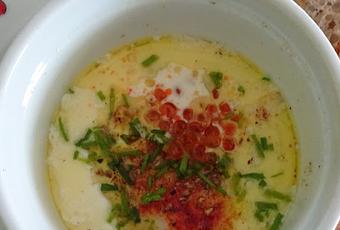Au moment de servir ajouter quelques oeufs de truite, des brins de ciboulette et accompagner de tartines de pain grillées.