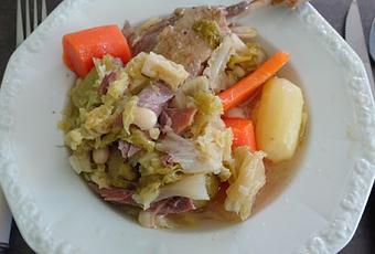 Prélevez 2 càs de graisse du confit pour graisser une cocotte et faites y mijoter 10 minutes sans coloration les poireaux et le chou émincés, puis les pommes de terre et les carottes pelées et coupées en morceaux, ainsi que l'oignon coupé en 4