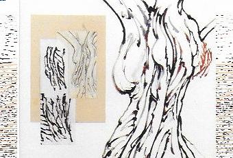 Tout laisse à penser que la Galerie Univer aime particulièrement la représentation des végétaux. On peut y voir des oeuvres de Marinette Cueco, de Monique Tello, Françoise Pétrovitch, Jean-Pierre Pincemin... Cette fois, ce sont les oeuvres de Gérard Titus-Carmel, une exposition intitulée Oeuvres d'amont et nouvelles pousses. On voit d'abord les Plans de coupe récents : diverses essences d'arbres présentées selon un procédé de collages de divers supports sur une assez grande toile (ci-contre plan de coupe - olivier). Puis, en avançant vers le fond de la galerie, on trouve des oeuvres plus anciennes où ce n'est pas le tronc, le bois mais plutôt le feuillage, de plus petits éléments venant des viornes et des lichens. Il n'y a pas deux arbres semblables même s'ils appartiennent à la même espèce et c'est sans doute aussi ce que constate l'artiste dans sa Figure du double. Et c'est devant ces oeuvres que je me suis posé cette question : l'arbre respire-t-il ? C'est qu'en effet nous voyons des corps et non pas des objets de décoration.