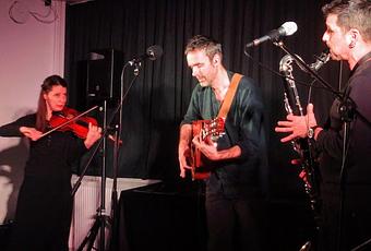 A 15h, il a sorti l'acoustique de sa housse et est rejoint par Caroline Lacroix ( violon et chant) et Nicolas Naudet (clarinette, clarinette basse et chant) pour entamer le programme Malo chante Brassens.