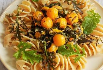 Avec ce morceau, j'ai fait une sauce pour pâtes. Pour la rendre gourmande, j'ai fait un fond de sauce, composé de carottes, de poireaux perpétuels, de céleri-branche, de persil et d' ail. J'ai aussi ajouté des blettes, pour apporter de la verdure. J'ai ajouté à la fin de la crème de riz. Enfin, j'ai aussi détaillé la courge en billes, pour le côté ludique et esthétique. J'ai accompagné le tout de salade moutarde japonaise et Mizuna.