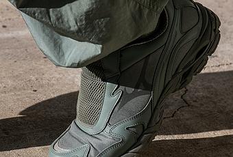 La paire propose un upper oscillant entre mesh balistique et cuir lisse pour un aspect robuste et technique bien assumé. Côté coloris, là encore l’aspiration militaire de la collaboration ressort avec des variations olives.