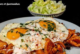 Déposez les œufs dessus et saupoudrez de paprika et d'herbes. Servez immédiatement.
