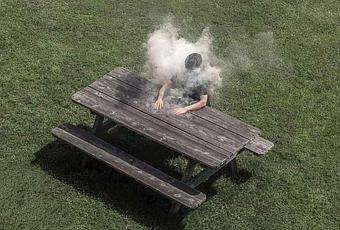- " As Usual " (2019) aborde la réification des corps dans un décor qui n'est pas un arrière-plan mais une scène où le corps asexué des modèles (la photographe elle-même ou ses amis dans la plupart des cas) vient s'imbriquer ou s'hybrider. C'est donc une distorsion de ce qu'on attend d'une représentation conforme du réel propre à susciter d'autres méandres narratifs de la part du regardeur, qui mettent en jeu aussi bien l'inconscient que l'histoire ou la culture personnelle de chacun.