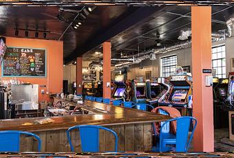 Le bar d’arcade comprend environ 30 jeux des années 1970 aux années 90. Des sons de classiques comme Street Fighter, Mario Bros. et Pac-Man sonnent fort dans toute la pièce. Caché à l’arrière se trouve un coin rempli de flippers, comme Terminator 2: Judgment Day et The Machine: Bride of Pinbot, pour n’en nommer que quelques-uns.