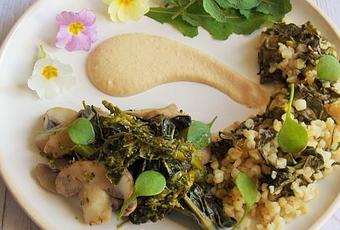 Aujourd'hui, je vous propose une Assiette complète Vegan aux champignons, fleurs de choux, boulgour, oseille et houmous :