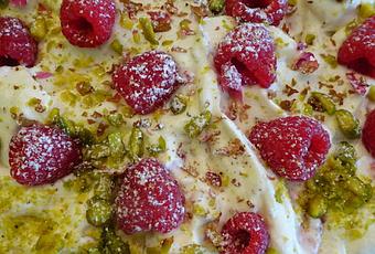Garnir avec le reste des framboises, les pistaches écrasées, le restes des pétales de roses et saupoudrer de sucre glace