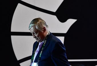 L'ex-champion du monde Anatoli Karpov, soutien du régime de Poutine, devant le logo de la Fédération internationale des échecs. Lors du tournoi des candidats à Ekaterinbourg, en Russie, en mars 2020. Photo © Pavel Lisitsyn pour AFP