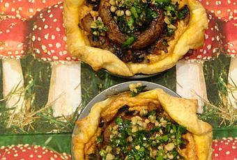 Remplir avec les champignons coupés et garnir avec les champignons entiers tête en bas en appuyant