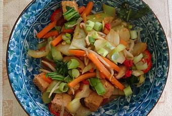 Quand je fais mes courses au Grand Frais je prends souvent les fiches recettes et cette fois-ci c'était une recette "spécial nouvel an chinois" . J'ai choisi la facilité en achetant les ingrédients de la fiche recette : une barquette de 450 g de légumes pour wok contenant du pak choï, des carottes, des haricots mungo, des shitakes et un bloc de 180 g tofu au piment d'Espelette. J'ai voulu savoir la date du nouvel an russe et je suis donc bien en retard avec mon repas nouvel an qui se fêtait cette année le 22 janvier. Tant pis, moi je l'ai fêté un mois plus tard, le 21 février. Chaque journée est bonne pour entamer une nouvelle année.