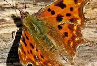 Polygonia c-album (Gamma, Robert le diable) : Papillon commun en forêt (lisières, clairières, chemins), dans les vergers et les friches. La découpe de ses ailes et le C blanc qui orne la face externe des postérieures permettent sa facile identification.