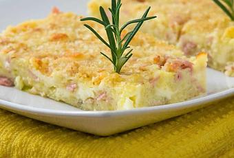 Saupoudrez les pommes de terre râpées et cubes de jambon sur la pâte puis versez en dessus votre mélange.