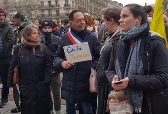 Nous étions sur le parvis de l’Hôtel de Ville, rassemblés aux côtés des nombreuses associations de Droits Humains. Paris est en solidarité avec le peuple ukrainien, sans oublier les russes et belarusses engagés contre la guerre.