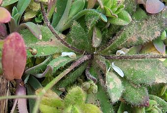 Draba verna var. verna (Drave printanière) : herbacée annuelle ; tige grêle dressée ; rosette basilaire de feuilles entières ovales-lancéolées hérissées de longs poils ; inflorescence en grappe terminale, fleurs à 4-5 pétales blancs profondément échancrés.