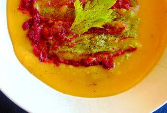 Soupe de betterave, ou plutôt purée devrais-je dire. En fait, un reste de houmos de betterave sans pois chiches .
